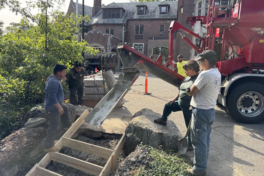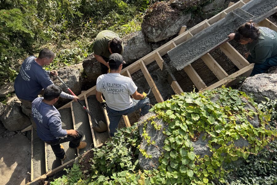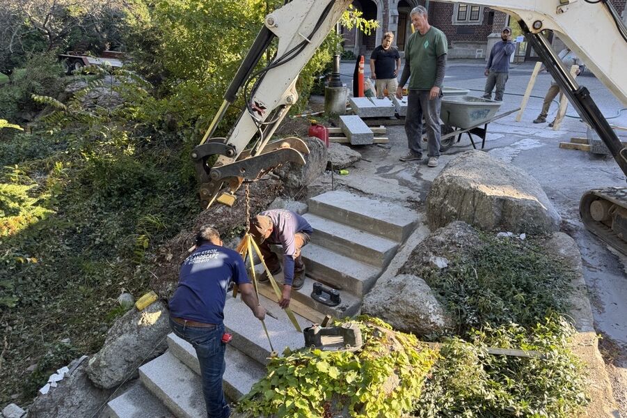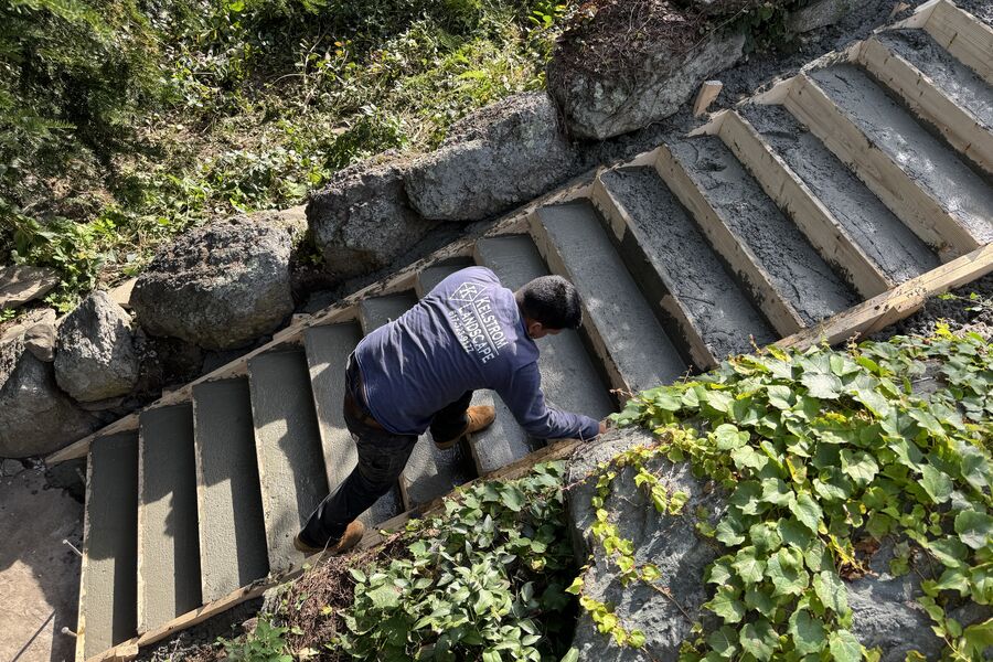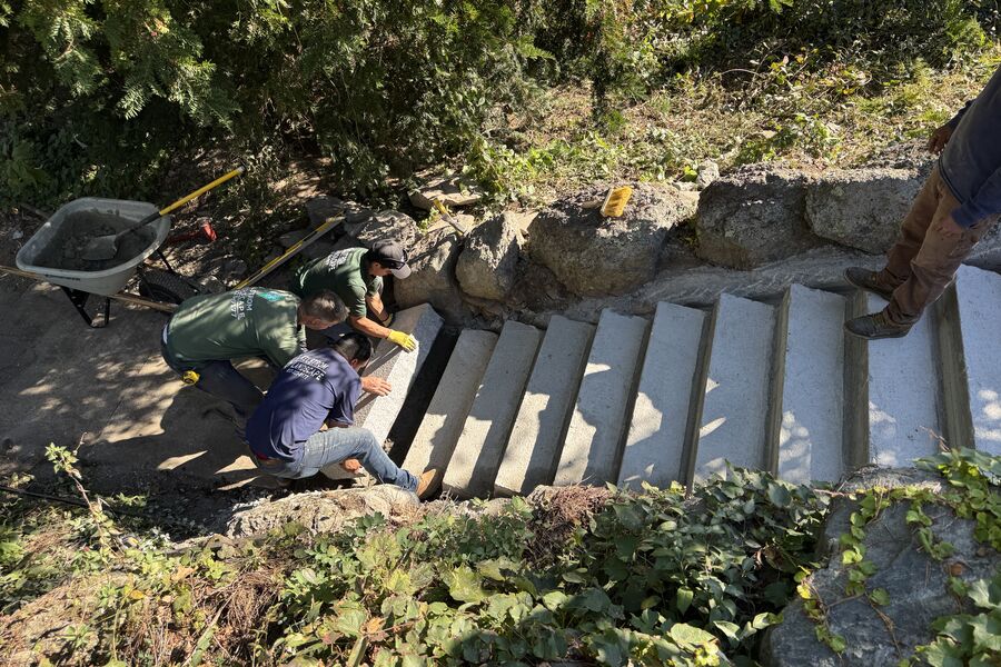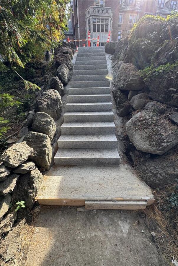 The project began with constructing a reinforced wooden mold and pouring new concrete. Once cured, the granite treads were set in place, and custom-fabricated railings were installed on both sides. In addition, the lighting along the path was repaired. The renewed staircase is already in daily use and adds both safety and beauty to the grounds.