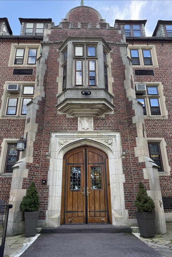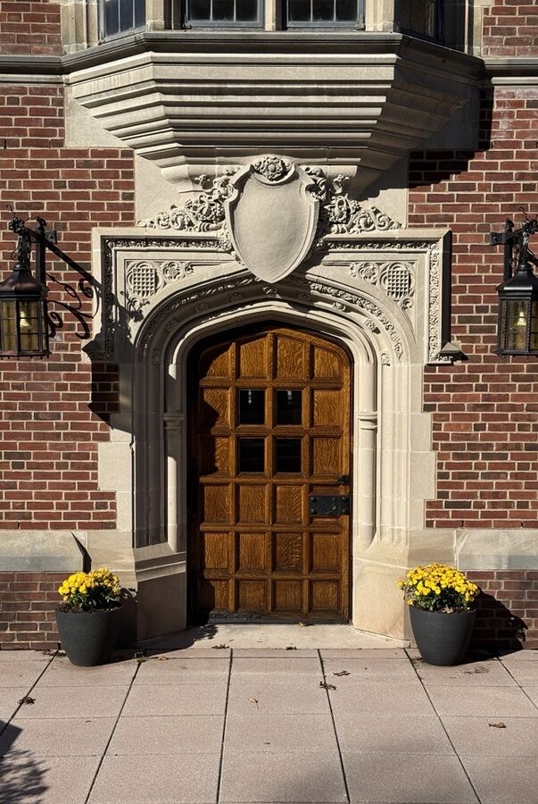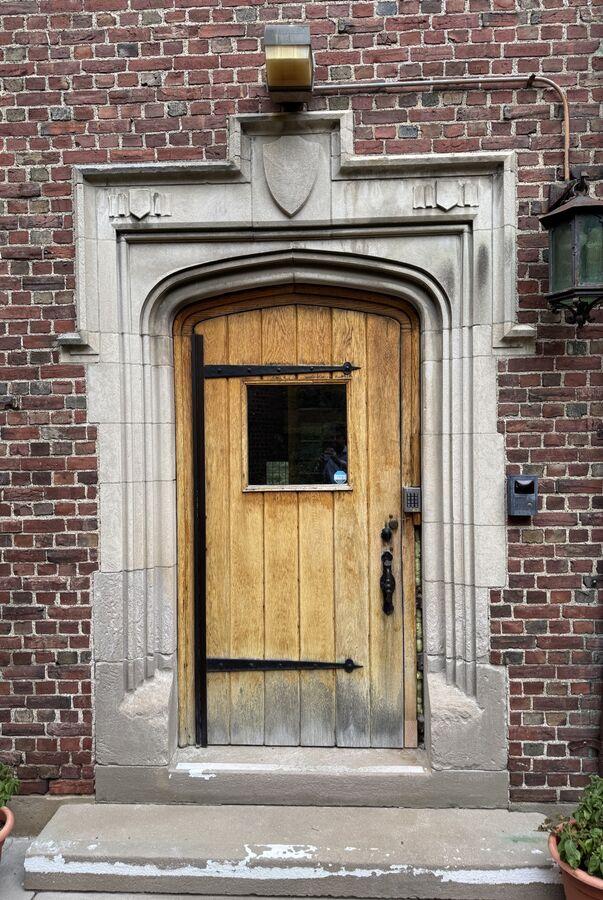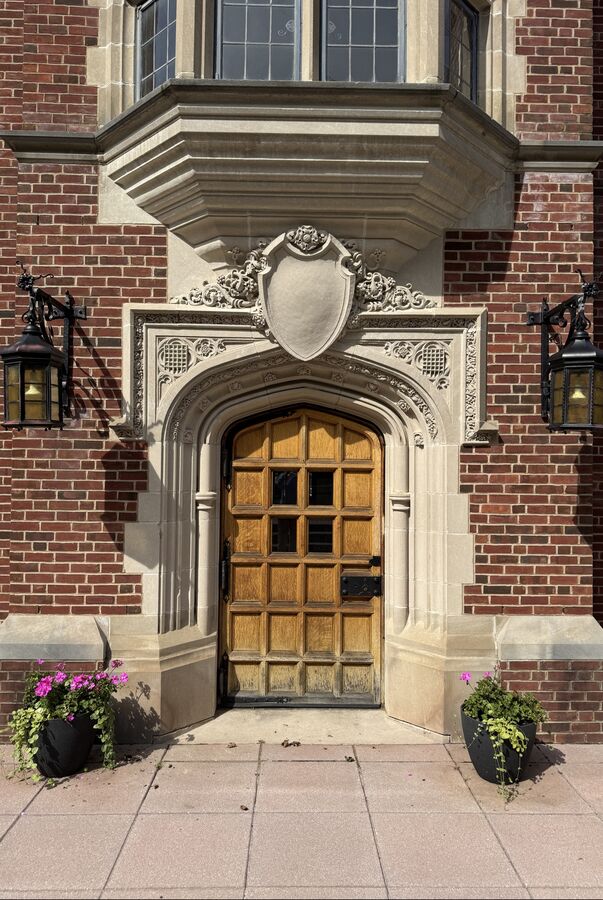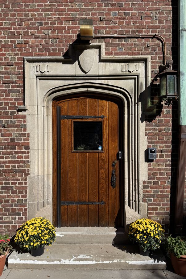 The large wooden door, originally from the Associates Building and now serving as the front door of the Christian Science Nursing Building